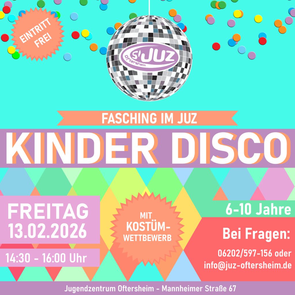 Am 13.02. findet unsere Kinderfaschingsdisco statt. Kinder zwischen 6 und 10 Jahren sind dazu eingeladen von 14:30-16:00 Uhr mitzufeiern!